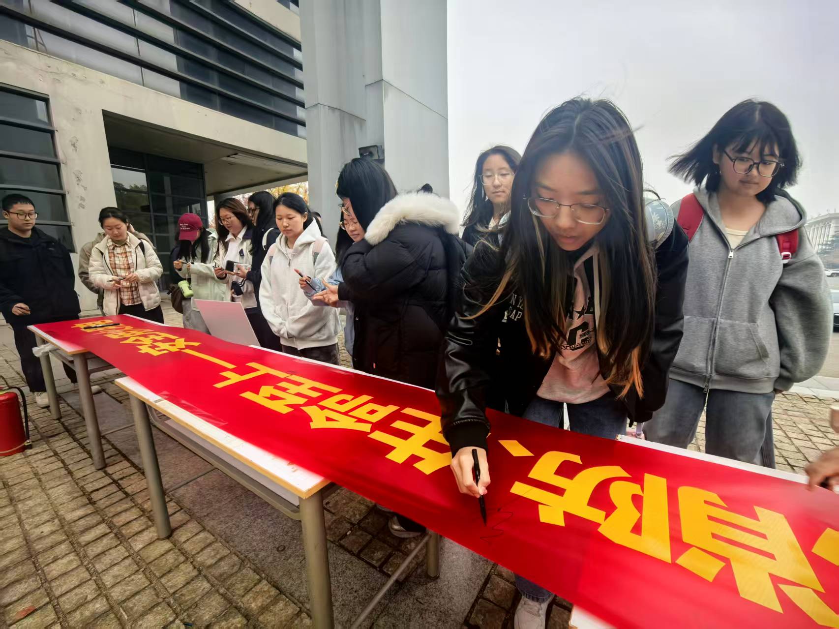 随后,同学们纷纷在“全民消防、生命至上——安全用火用电”主题条幅上郑重签下自己的名字,表达参与消防安全建设、守护校园平安的坚定意愿。