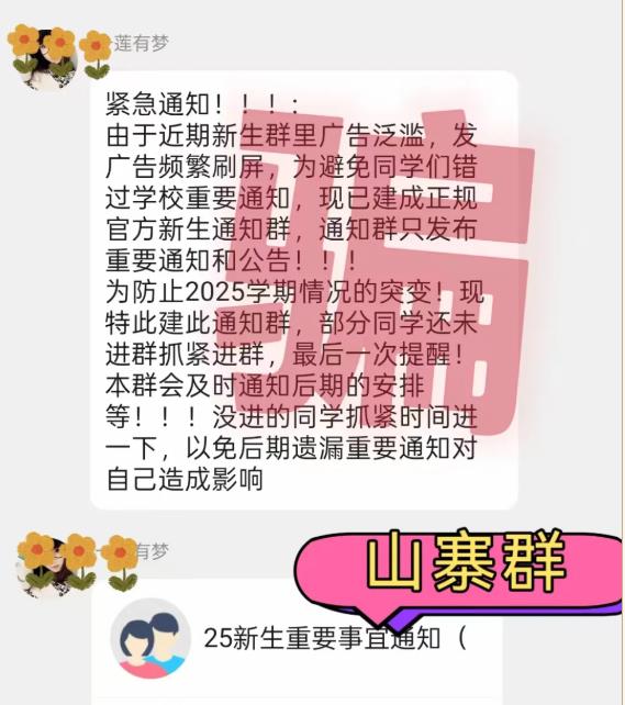 对任何自称“学长学姐”“老师”等身份,通过私聊或非官方渠道邀请加入的各类“新生群”“通知群”“交流群”等,务必保持警惕,切勿轻易添加或入群。